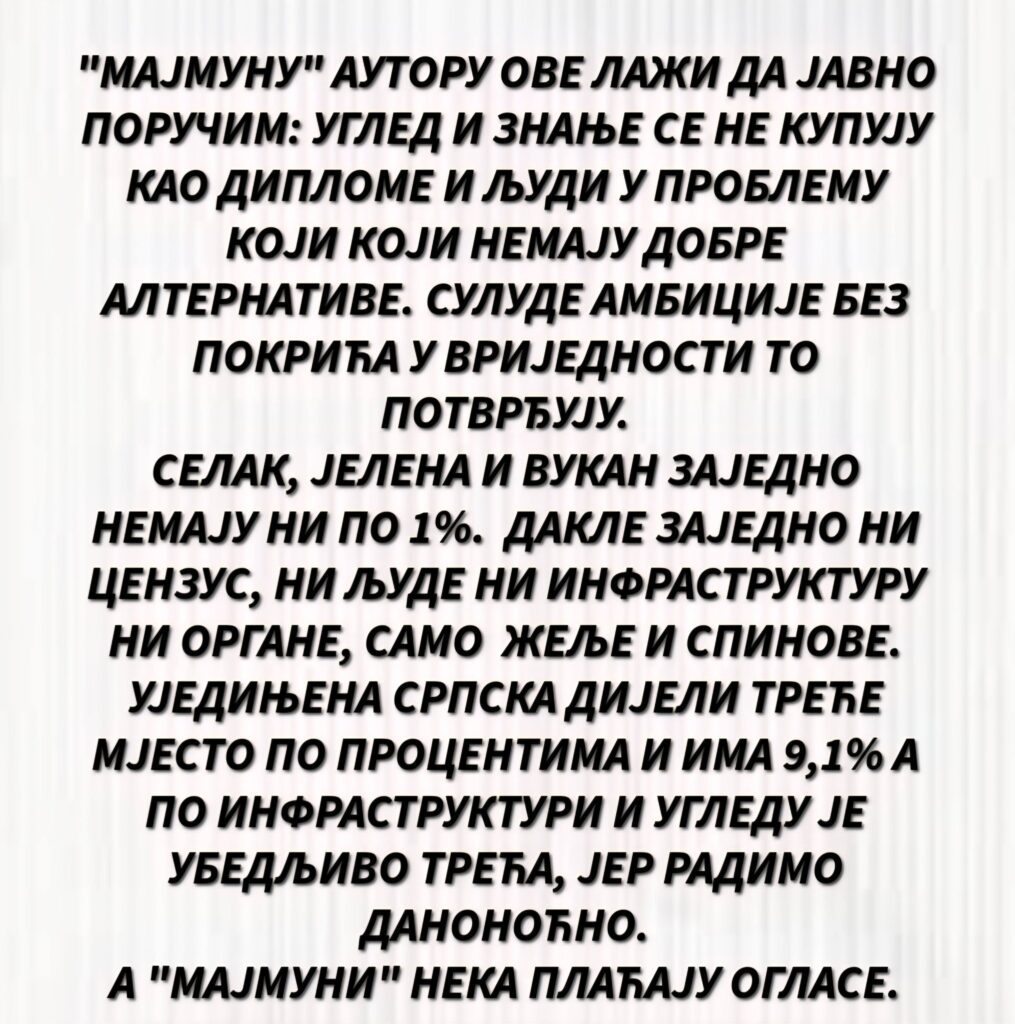 – “Majmunu”, autoru ove laži, da javno poručim: ugled i znanje se ne kupuju kao diplome i ljudi u problemu koji nemaju dobre alternative. Sulude ambicije bez pokrića i vrijednosti to potvrđuju. Selak, Jelena i Vukan, zajedno nemaju ni po 1 odsto. Dakle, zajedno, ni cenzus, ni infrastrukturu, ni organe, samo želje i spinove – rekao je Stevandić.