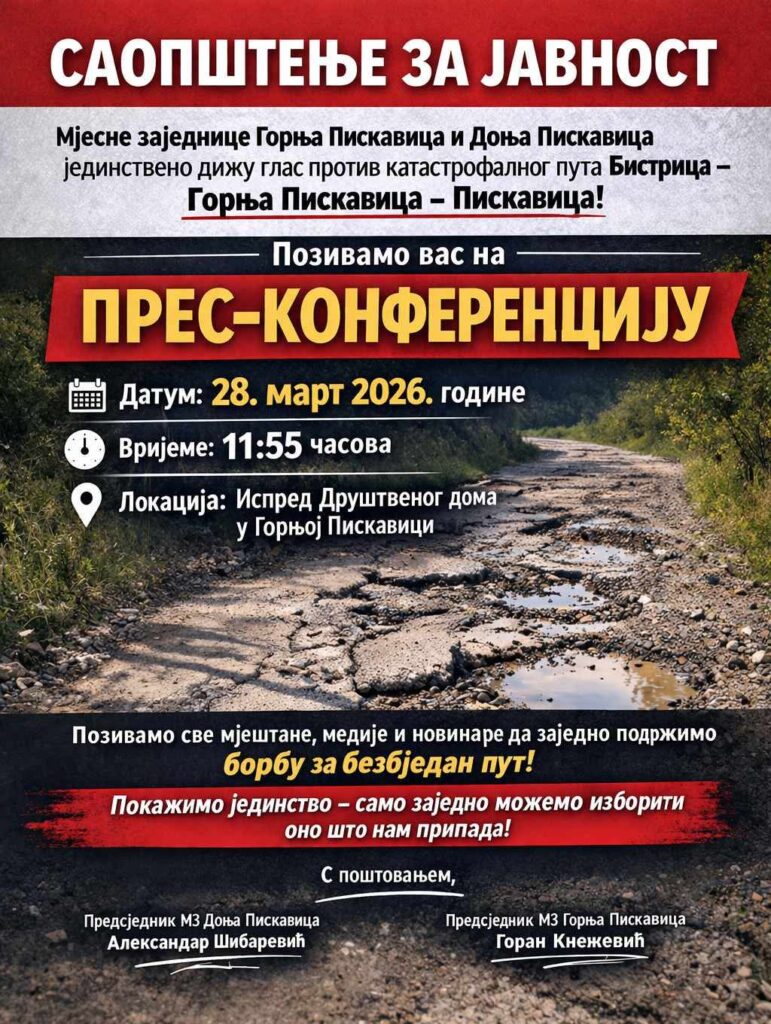 Konferencija za medije biće održana 28. marta 2026. godine u 11:55 časova, ispred Društvenog doma u Gornjoj Piskavici.