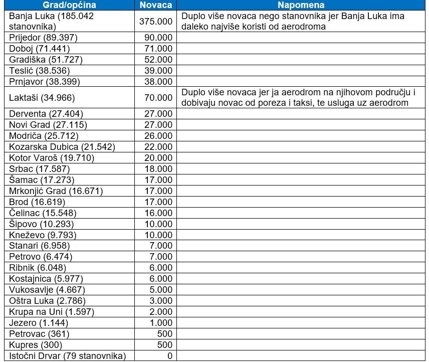Opštine koje gravitiraju Banjoj Luci su iz regije Banja Luka, regije Prijedor i regije Doboj. Ove opštine imaju 754.000 stanovnika. Smatram da bi svaka opština trebalo da plati 1 EUR po svakom stanovniku opštine, a da bi Banja Luka trebalo da plati duplo, jer je daleko najveći broj putnika vezan za Banju Luku, kao i Laktaši duplo, jer je aerodrom na njihovoj teritoriji i oni od njega zarađuju kroz poreze, taksi-prevoz, usluge uz aerodrom… Stoga bi finansiranje drugog miliona trebalo da bude na lokalnoj zajednici po sledećem ključu: